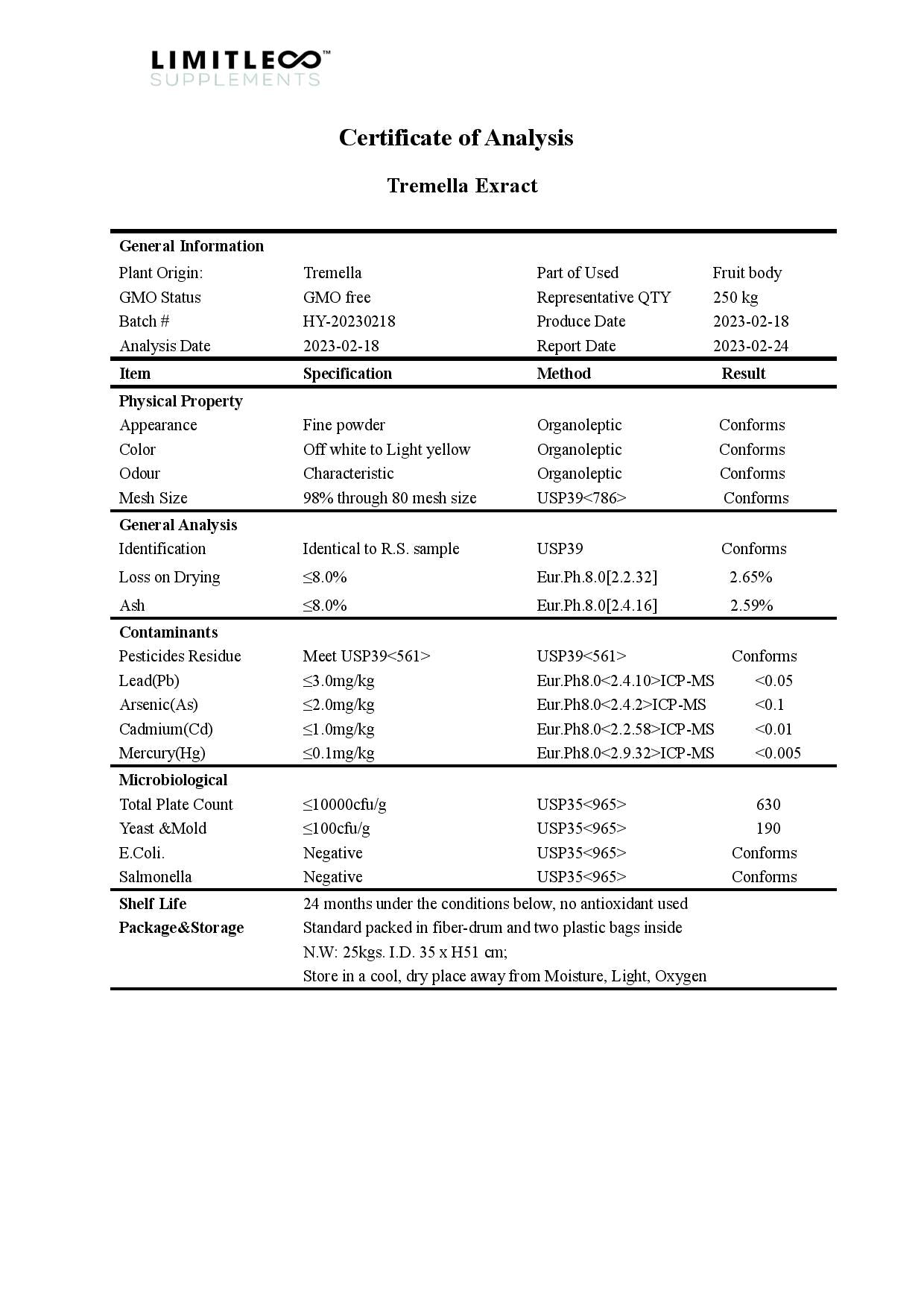Ingredients: Tremella Mushroom Extract, (30% Polysaccharides).