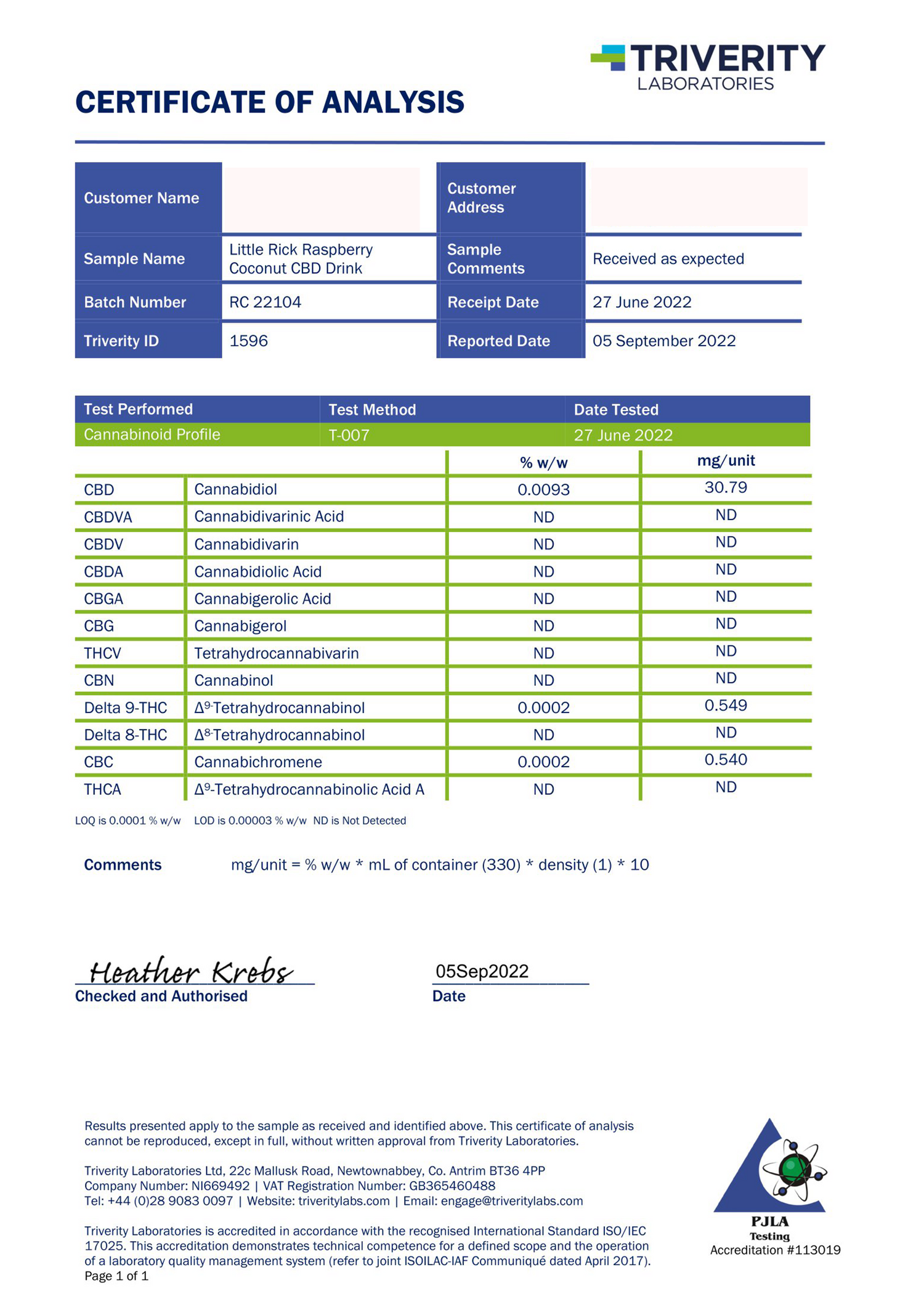 12 x Little Rick 32mg CBD Sparkling 330ml Raspberry Coconut Drink