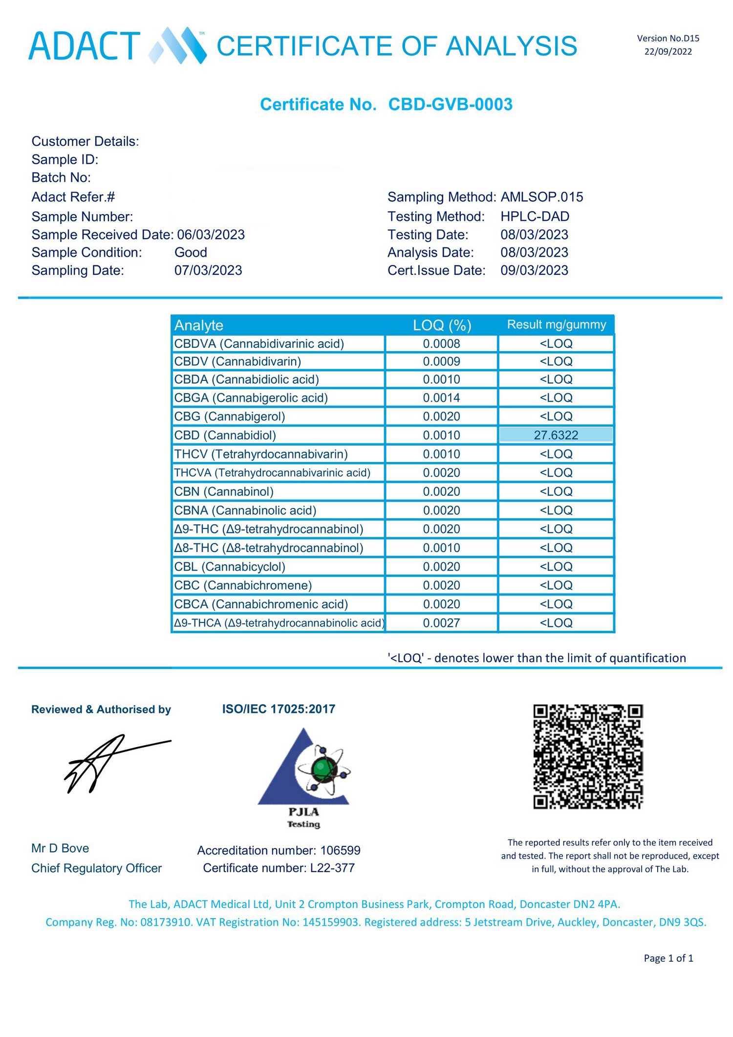 Cannabis Sativa L (Broad Spectrum), Sugar, Glucose, Syrup, Water, Wheat, Starch, Modified Maize Starch, Acids (Lactic Acid, Malic Acid, Citric Acid), Modified Potato Starch, Acidity Regulators (Sodium Malates, Sodium Hydrogen Carbonate), Plant and Vegetable Concentrates (spirulina, Safflower, Black Carrot), Flavouring, Colour (Curcumin).Carrier Oil: MCT Oil